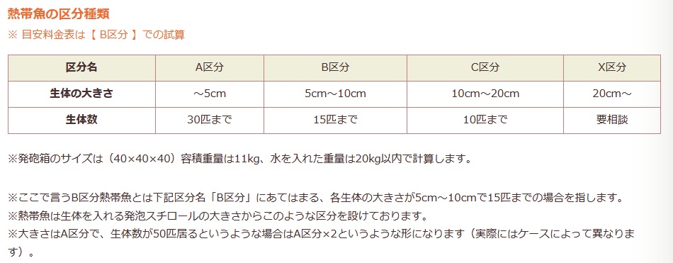 熱帯魚(一匹の大きさが5㎝~10㎝で15匹までの場合)の輸送、東京⇔大阪間で39,900円となっています。